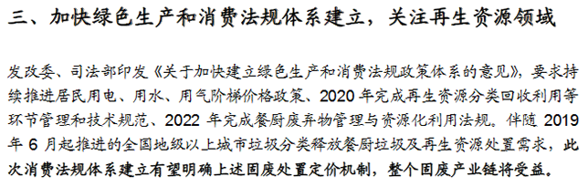 加快綠色生產和消費法規(guī)體系建立,有利于順價機制建立。發(fā)改委、司法部印發(fā)《關于加快建立綠色生產和消費法規(guī)政策體系的意見》,要求持續(xù)推進居民用電、用水、用氣階梯價格政策、2020年完成再生資源分類回收利用等環(huán)節(jié)管理和技術規(guī)范、2022年完成餐廚廢棄物管理與資源化利用法規(guī)。伴隨2019年6月起推進的全國地級以上城市垃圾分類釋放餐廚垃圾及再生資源處置需求,此次消費法規(guī)體系建立有望明確上述固廢處置定價機制,整個固廢產業(yè)鏈將受益。