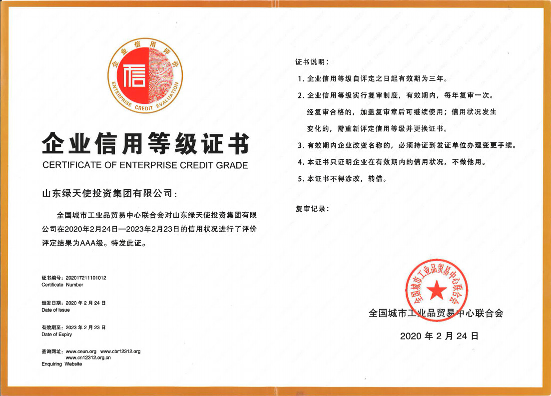 為加強企業的誠信建設,推動行業自律,近日,山東綠天使投資集團有限公司完成了AAA信用體系申請認定各項工作,并獲得由國家商務部和國務院國資委授權國家一級行業協會頒發的企業信用評級AAA等級認定資質。