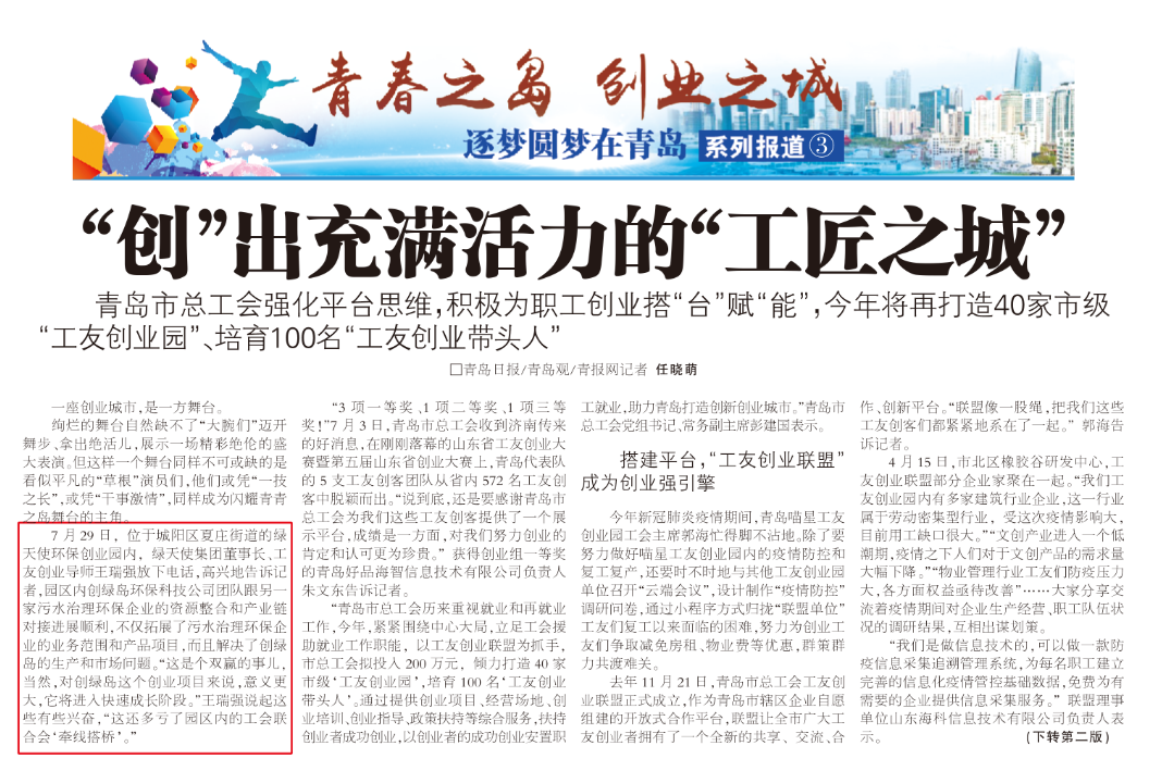 7月29日,位于山東省青島市城陽區夏莊街道的綠天使環保創業園內,綠天使集團董事長、工友創業導師王瑞強放下電話,高興地告訴青島日報記者,園區內青島創綠島環保科技有限公司團隊跟另一家污水治理環保企業的資源整合和產業鏈對接進展順利,不僅拓展了污水治理環保企業的業務范圍和產品項目,而且解決了創綠島的生產和市場問題。“這是個雙贏的事兒,當然,對創綠島這個創業項目來說,意義更大,它將進入快速成長階段。”王瑞強說起這些有些興奮,“這還多虧了園區內的工會聯合會‘牽線搭橋’。”