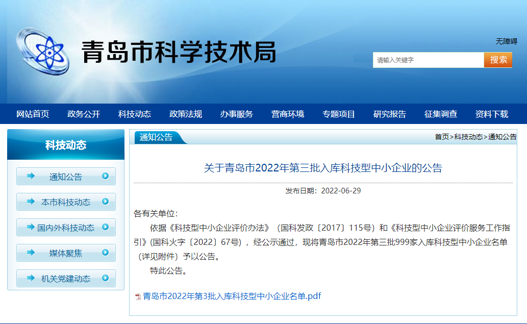 近日,青島市科技局公示了2022年第三批進入科技型中小企業的名單,綠天使多家園區企業順利通過青島市科技局認定,成功入庫。