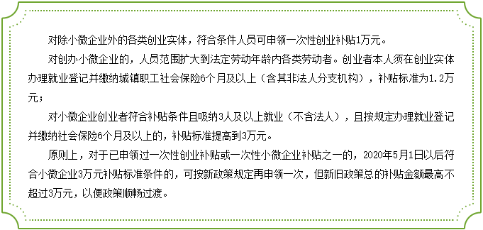 2020年4月30日前申請的一次性創業補貼和小微企業創業補貼的仍按原政策標準受理審核。